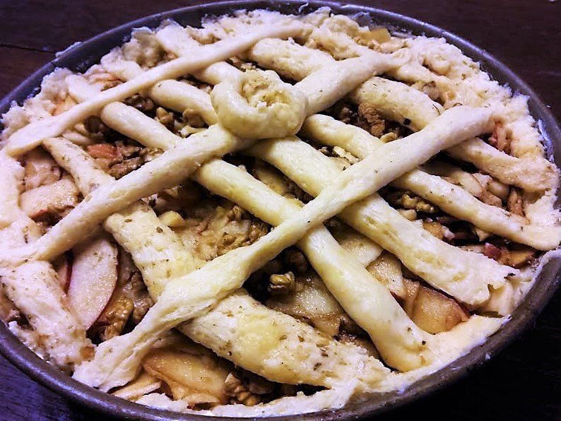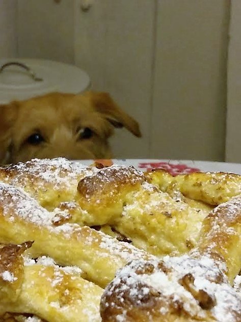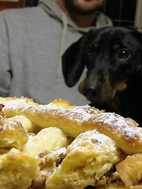 Szóval előszedtem a szép idaredjeimet és nekiálltam az attrakciónak. Új receptet próbáltam ki, mert mindig omlós tésztával sütök pitét. Legyen ez most egy kelt tésztájú szülinapi torta. Azt tudtam, hogy rusztikusabbat szeretnék, mint a recept képén. Virágokkal nem akartam bíbelődni, gondolom Pista se vágyott azokra a tésztavirágokra. Viszont rengeteg diót tettem bele darálva és darabban is. A tetejének díszítésére, tésztarácsok sodrásakor megérkeztek Zaváék, gurítottunk drága szomszédom, István finom pálinkájából is ennek örömére, fantasztikus hurkákat sodortunk utána 🙂 Gépészekről, mérnök emberekről beszélünk, nálunk Laci kohász indulóval altatta anno Vincét. Rusztikusabb, bányásznak is megfelelelő tortává kellett átgyúrnom a receptet. Sikerült is, egy hétig meneteltünk tőle egy irányba..