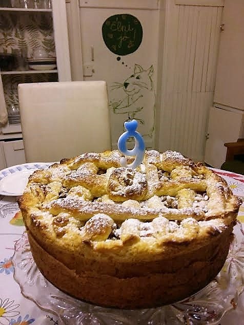 Az almatortára gyertya került (nem 9 éves Pista, de ez volt csak itthon). Tartalmas sütemény, több embernek ideális. Egy üveg finom borral pláne. Mikor eszegettünk, Soft Cell szólt. Fantasztikus volt a kettő együtt!