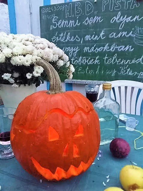 Míg én bent szöszöltem, a srácok kifaragták a halloween-i tököt dekopírfűrésszel… A finom gyümölcsöket kiélveztük folyékony formában is, hála a szomszéd Istvánunk pálinkájának és Zava apukája pálinkájának. Plusz borának. Itatta magát. Kell is az, kivirágzunk tőle. Innen is üdvözlöm őket meleg szeretettel!