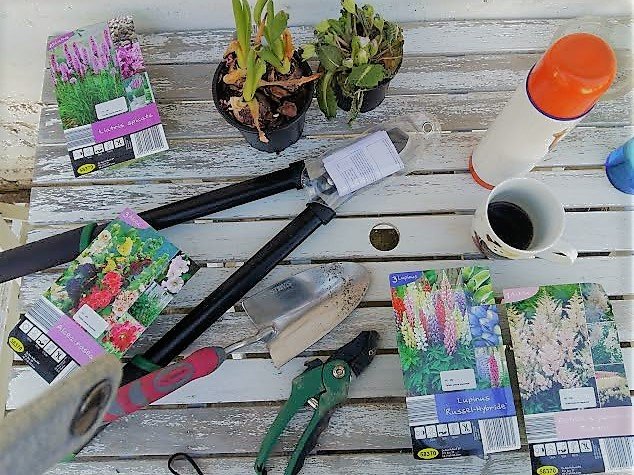 Kipakoltam a hóbelebancomat, és nekilódultam. A termoszban langyos vízben ázik két féle mag (bíbor kasvirág és bársony óriási színes napraforgó), egy kornyadozó primula és egy levitézlett jácint is költözik majd a többi túlélő mellé a kertbe. Pár rizóma is ültetésre vár és az alap eszközök: metszőolló, ágvágó, kézi ásó és kávé nekem. A talicska és a trágya nem fért az asztalra, meg az ásó sem és a kert nagy része.