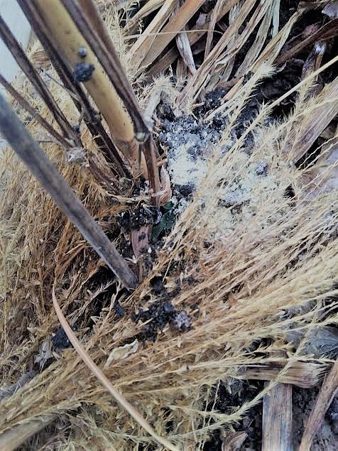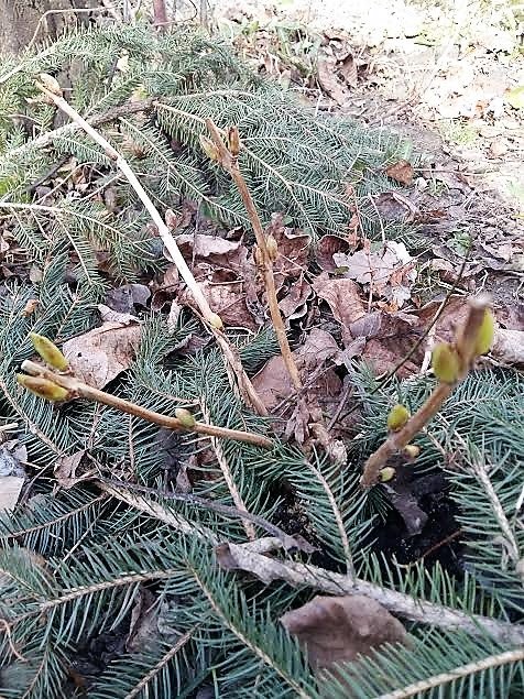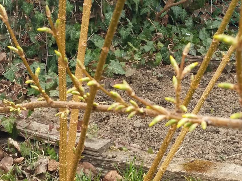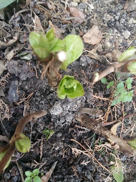 A hortenziák emberkednek (ahogy másik szomszédom, Joli néni mondaná), ébredeznek, még a fenyőtakarót rajtuk hagytam, trágyát kaptak alá.