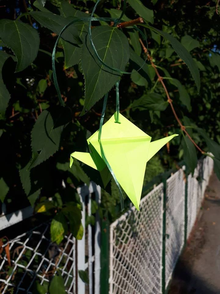 Hazafelé pedig belebotlottam a metszés inverzébe, azaz valaki origami madarakat aggatott az utcára integető aranyesőmre 🙂