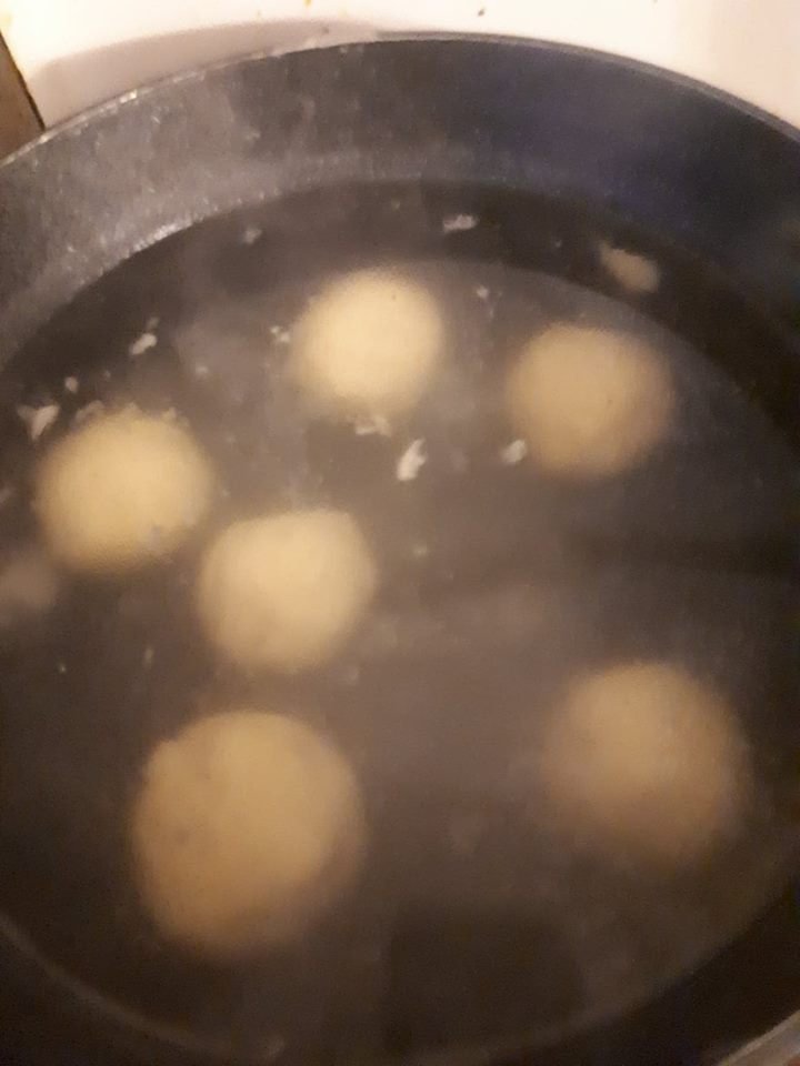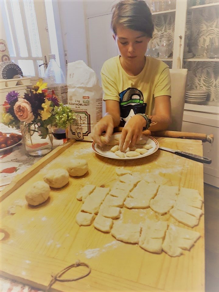 Vincét megkértem, hogy a tészta 1/3-ából nudlit gömbölyítsen. Sok lett volna mind gombócnak. 2 cm-es csíkokra vágtam a kinyújtott lapot, azokat kb. 3-4 cm-es darabokra és azt formázta egyenként: