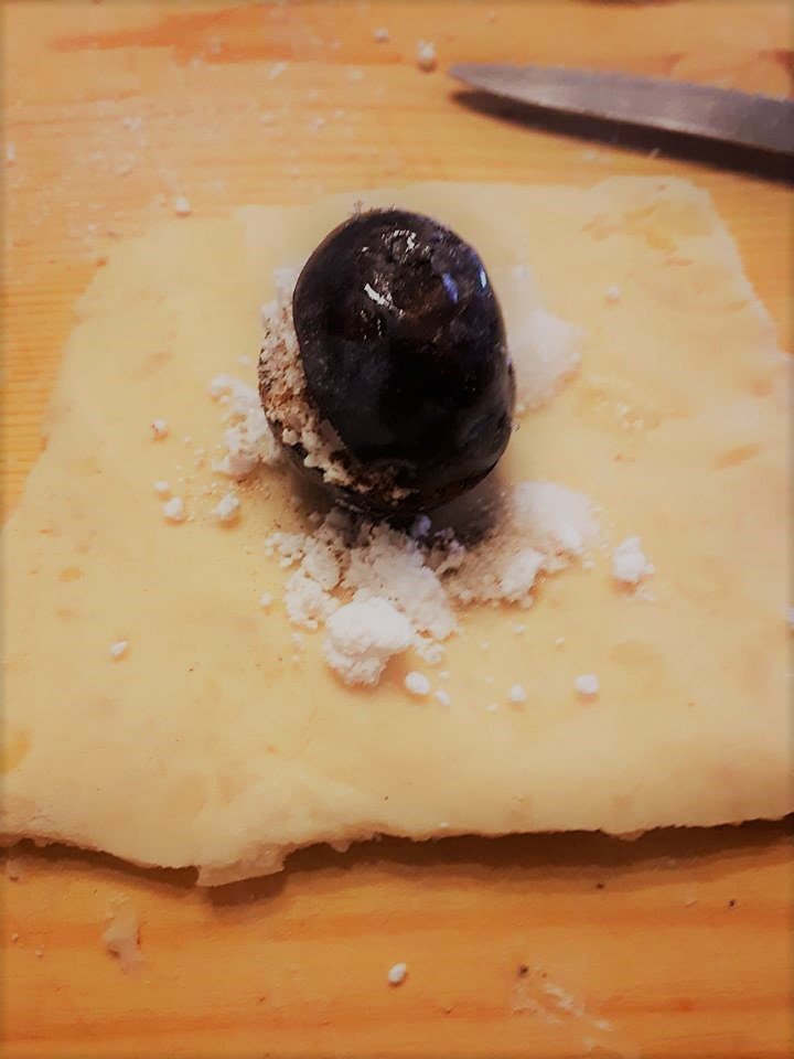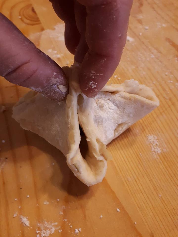 A tésztához krumplit főztem, Vince fiam átnyomta, mikor puhára főtt. Kihűlt és lisztet, tojást tettem hozzá kis sóval, szilványi zsiradékkal (én vajat). Összegyúrtam, 2-3 mm vékonyra nyújtottam, felvágtam négyzetekre.