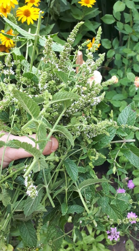 Első körben lemetszem az elnyíltakat, elszáradtakat. Mentánál a felvirágzást most előzöm meg, így a levélre fordítom vissza az energiát. Mikor lehullottak a fejek, mindenki kap egy kis káliumot, vasat, tápanyagokat, hogy visszatápláljam az elveszett, elfáradt erőt így a nyár közepén. Hadd cseperedjenek tovább peckesen, ne erőlködve, köhécselve. Tejes permettel futok végig még leginkább a szőlőt, paradicsomokat célozva, de mindenki kap belőle, senkinek nem hiányzok a gombásodás (Anita szuper zsíros házi tejét használom erre is).