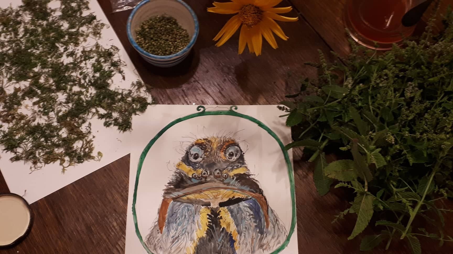 A gyógynövény morzsolás, begyűjtés, szárítás, illatterápia annyira szép és relaxáló folyamat, hogy egy pókportré festés lett a vége. (koriander, menta, citromfű, zsálya, málnalevél, levendula, bazsalikom rebarbara)